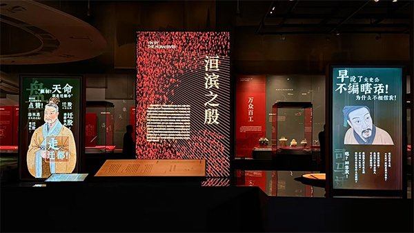 看·见殷商展览内容分为“有册有典”“青铜高峰”“居中衍大”“式范后世”四个部分,从商王世系入手,进而展示殷商时期的生产、生活、社会组织与精神生活,最后展示殷商时期在中华文明起源过程中的历史地位。在展览中,运用AI技术,使历史人物活起来,同时还包括投影、LED、OLED、互动屏等。