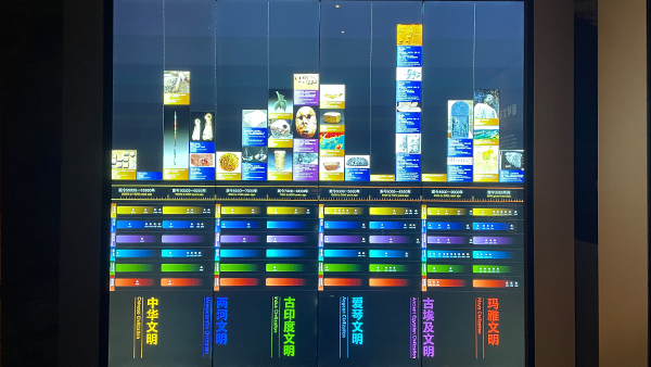 中国考古博物馆的一层为百万年人类史展厅,二层系统勾勒中华文明起源形成发展图景,三层丰富完善夏商周王朝特质。基本陈列包括“文明起源”“宅兹中国”“大国一统”“和融万方”“民族觉醒”5个专题。在展览中,其中包括多通道投影、精准对位、OLED、互动屏幕、LED、实景拍摄等。